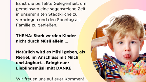 Herzliche Einladung zur Familien-Mitmach- Kirche am 31. August um 10 Uhr in der Stadtkirche. Dabei ist der Kinderchor mit Katamba Kazaku, Pfrin. Natascha Reuter, Mitarbeiterinnen und natürlich gibt es im Anschluss ein kleines Zusammensein. ALLE -auch "Große" sind willkommen und können sicherlich einen mutmachenden Gedanken mitnehmen. Thema: Stark werden Kinder nicht durch Müsli allein ...